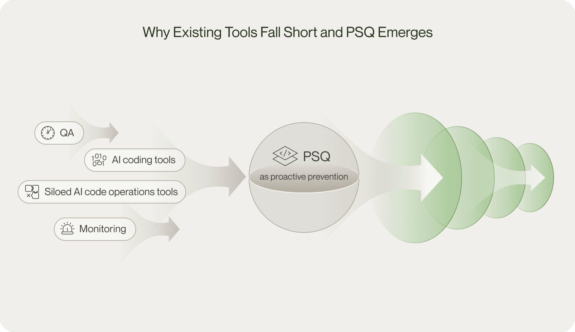 The traditional toolchain wasn’t built to solve these problems. QA remains reactive: defects surface post-deployment or through customer escalations. Monitoring and observability detect outages but do little to prevent regressions.