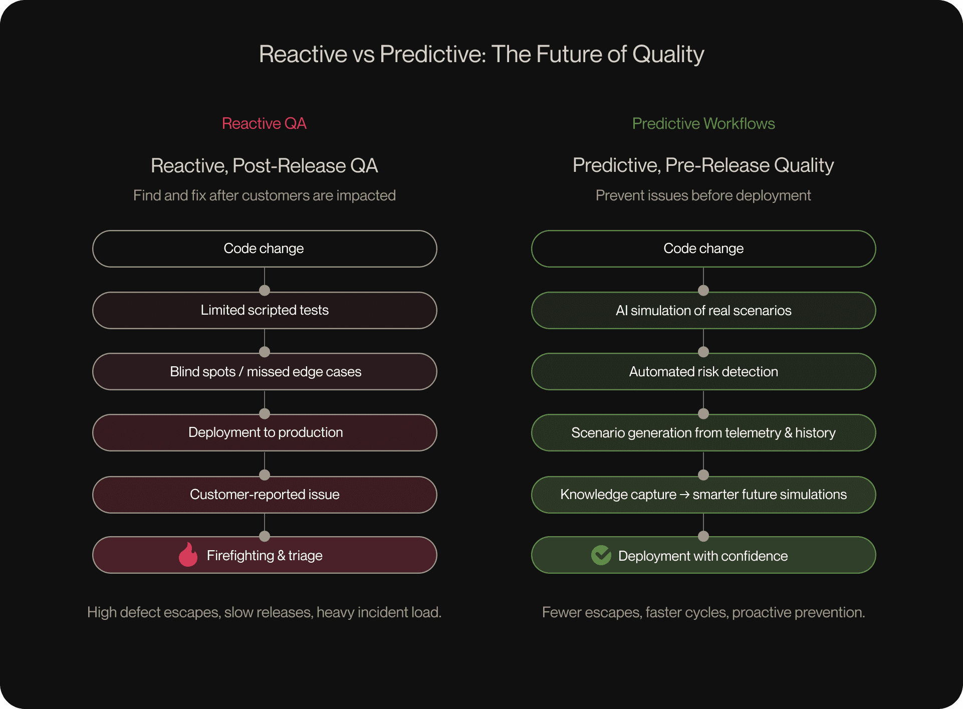 Enterprises don’t need another reactive tool or siloed approach. The solution requires anticipating problems—a paradigm shift from chasing defects after release to predicting and preventing them in advance.